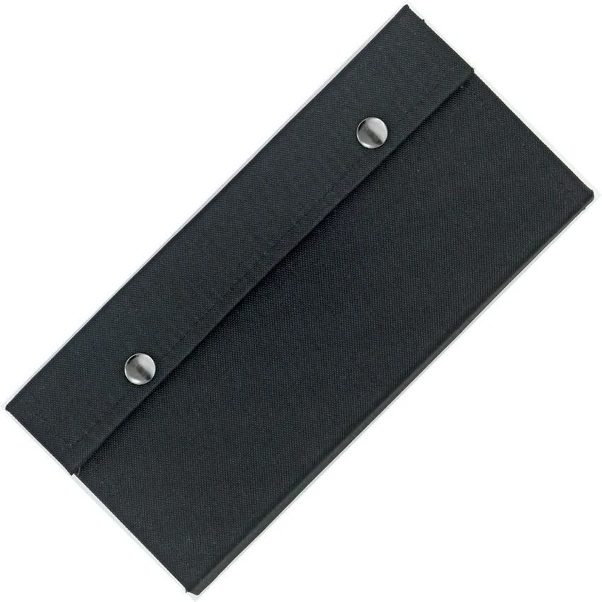 Measures 10 1/2″ x 4 7/8″ closed. Durable black Cordura construction. Brown velvet lining. Durable elastic straps to hold knives securely. Holds 12 folding knives. Snap closure.Â