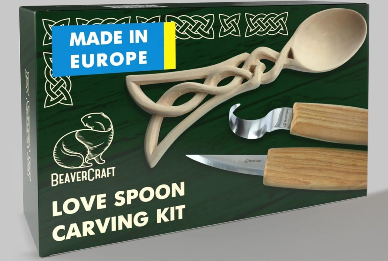 BeaverCraft made a complete whittling starter kit that allows you to make a spoon with Celtic knots handle yourself without buying anything else as everything included in a box. This hobby starter kit is the best bet for 12+ years old kids, teens, adults.