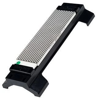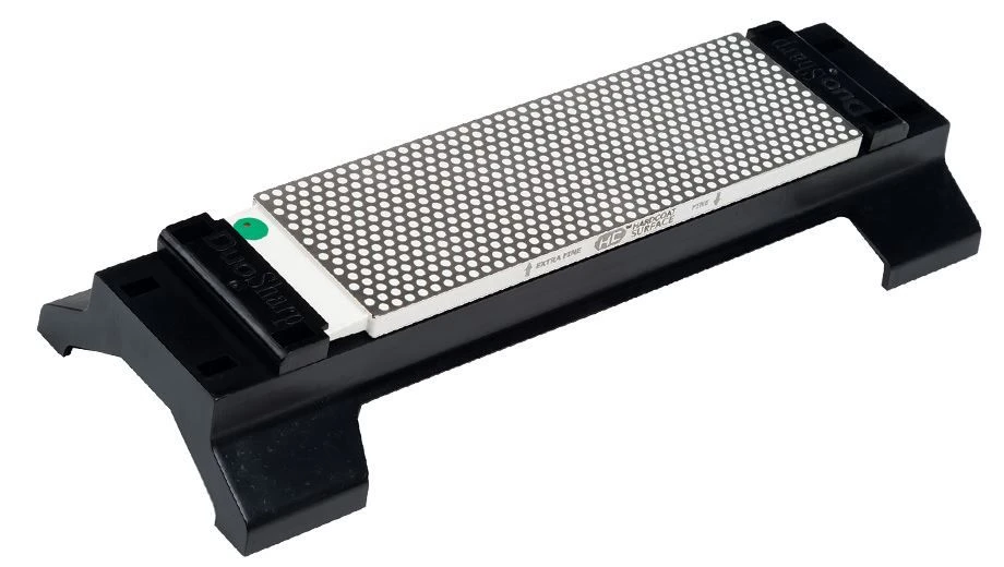 Innovative, multi-patented DuoSharp Bench Stone is a precision flat, two diamond surfaced sharpener guaranteed to provide consistent, even sharpening every time. Now offered with Hardcoat surface for extra durability when used specifically for the hardest steels and ceramic blades. Designed to withstand the rigors of sharpening ceramic knives, this 8″ DuoSharp Bench Stone, is an excellent counter and bench sharpener, with a larger, wider diamond surface for sharpening a variety of edges. The model comes with a Bench Stone Base Accessory. HC Extra-Fine diamond (9 micron /1200 mesh) to polish and refine a razor edge after sharpening with a coarser diamond; HC Fine diamond (25 micron / 600 mesh) for a razor sharp edge. Sharpening with diamonds is fast and easy. No messy oils needed—sharpen dry or with water. Durable construction will provide years of consistent performance and reliable service. For proper tool maintenance, woodworkers, chefs and other professionals rely on the superior quality and versatility of DMT products. Made in USA.