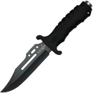 The Survivor Fixed Blade Outdoor Knife (HK-1036S) features a black straight edge blade and a black rubber handle, with a 10 1/2 inch overall length.