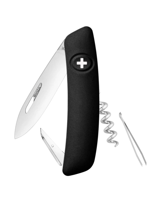Blade with safety lock to prevent from closing when working. The blade can be unlocked by pressing the SWIZA cross.
